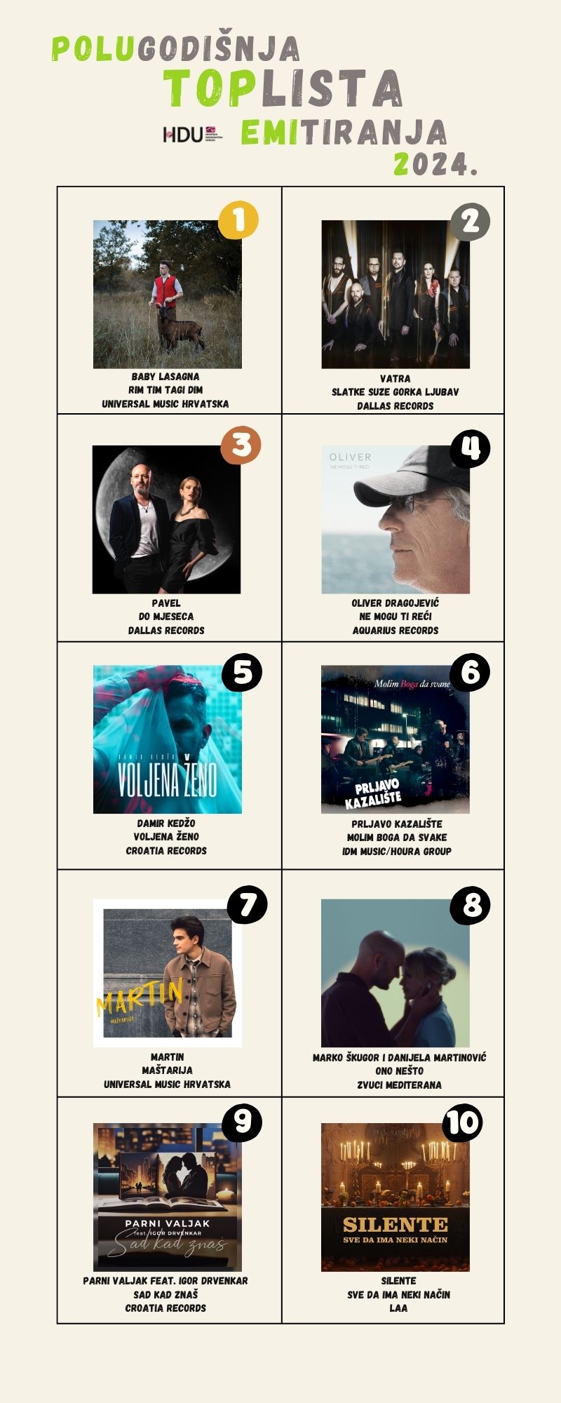 Polugodišnja lista najemitiranijih domaćih snimaka donosi službene i sveobuhvatne rezultate mjerenja radijskog emitiranja na preko 130 radijskih stanica u Hrvatskoj prema podacima servisa 1Played i Hrvatske diskografske udruge. Podaci se odnose na tjedan od 1. siječnja do 30. lipnja 2024. godine. Popis 100 najemitiranijih domaćih pjesama u Hrvatskoj pogledajte na stranicama top-lista.hr.